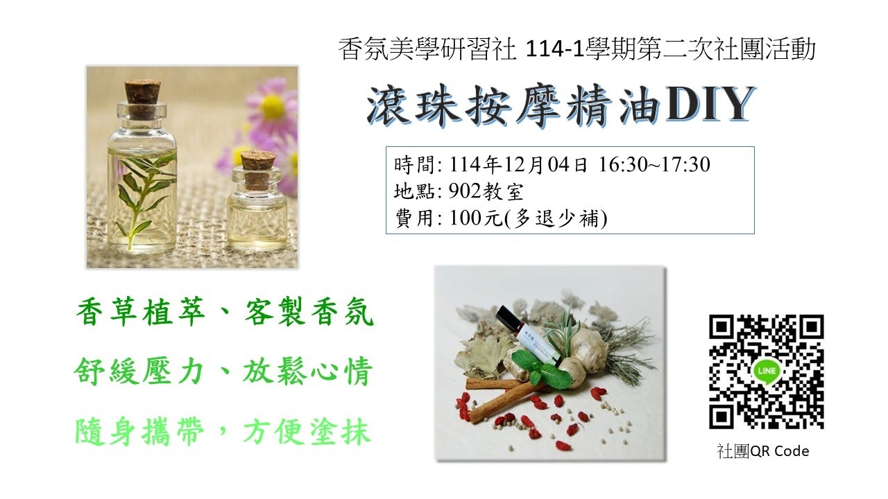 【香氛美學研習社】114-1第二次活動 時間:114年12月04日(四)16:30-17:30 地點:圖資大樓902教室 報名至11/28截止 https://forms.gle/BhAqsNmx4c61mCfb6